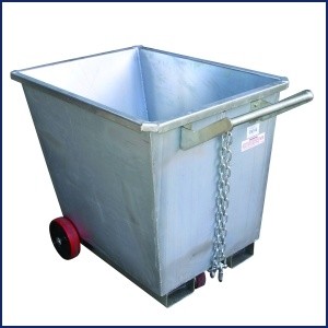 The tipping bin is light weight and cost effective bin suitable for goods transport, storage or waste. Fitted with Forklift carriage, these Bins are designed for manual push over. Wheels are fitted as standard, 2 front and 1 swivel at the rear. Supplied with Safety Chain for securing to Forklift. Zinc Plated finish.